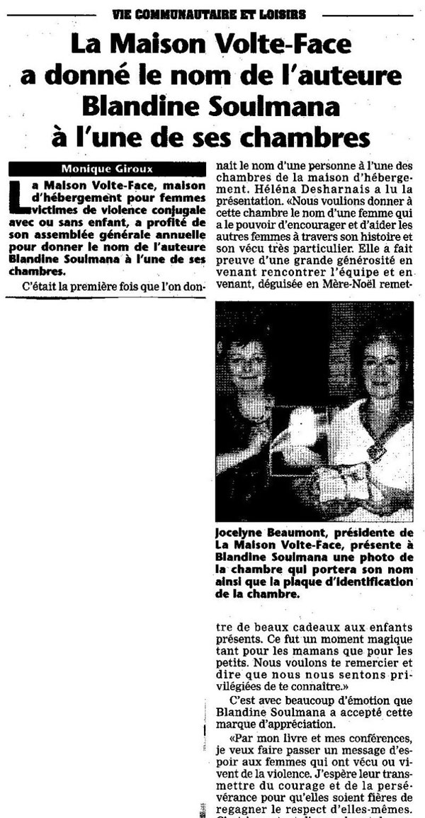 La maison Volte-Face a donné le nom de l’auteure Blandine Soulmana à l’une de ses chambres - Le Haut-Saint François